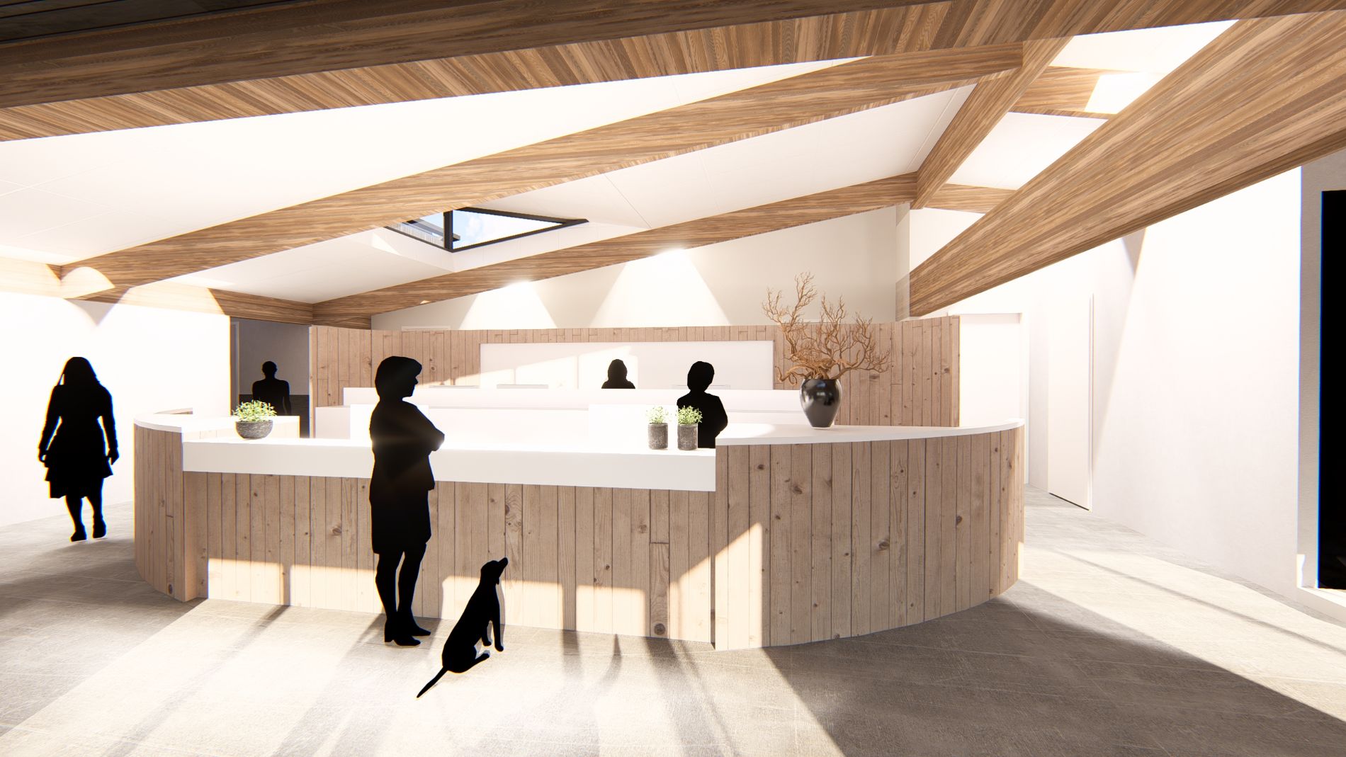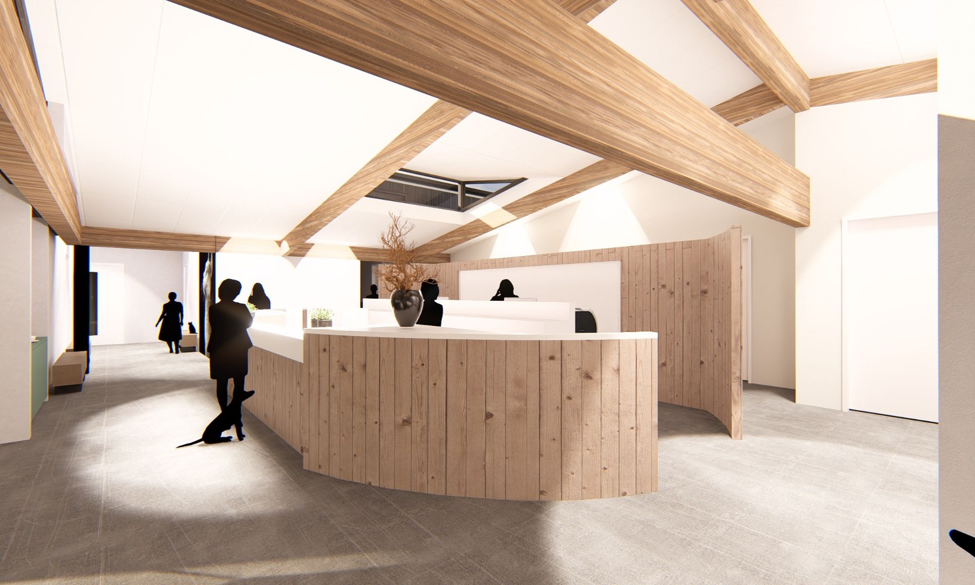 De centrale open balie in het hart van de praktijk versterkt dit beeld en vormt de kern van de praktijk .
