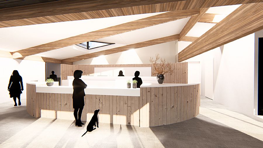 De oude dak constructie, met de bestaande gelamineerde houten spanten, is weer zichtbaar gemaakt waardoor deze beeldbepalend zijn geworden in het interieur.