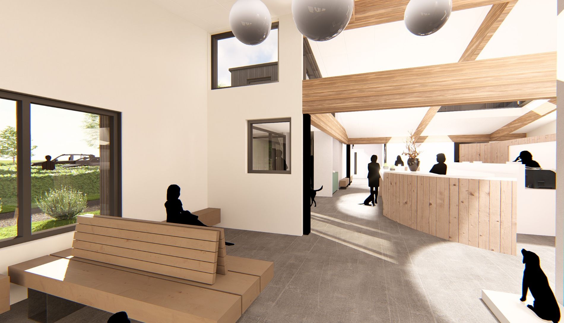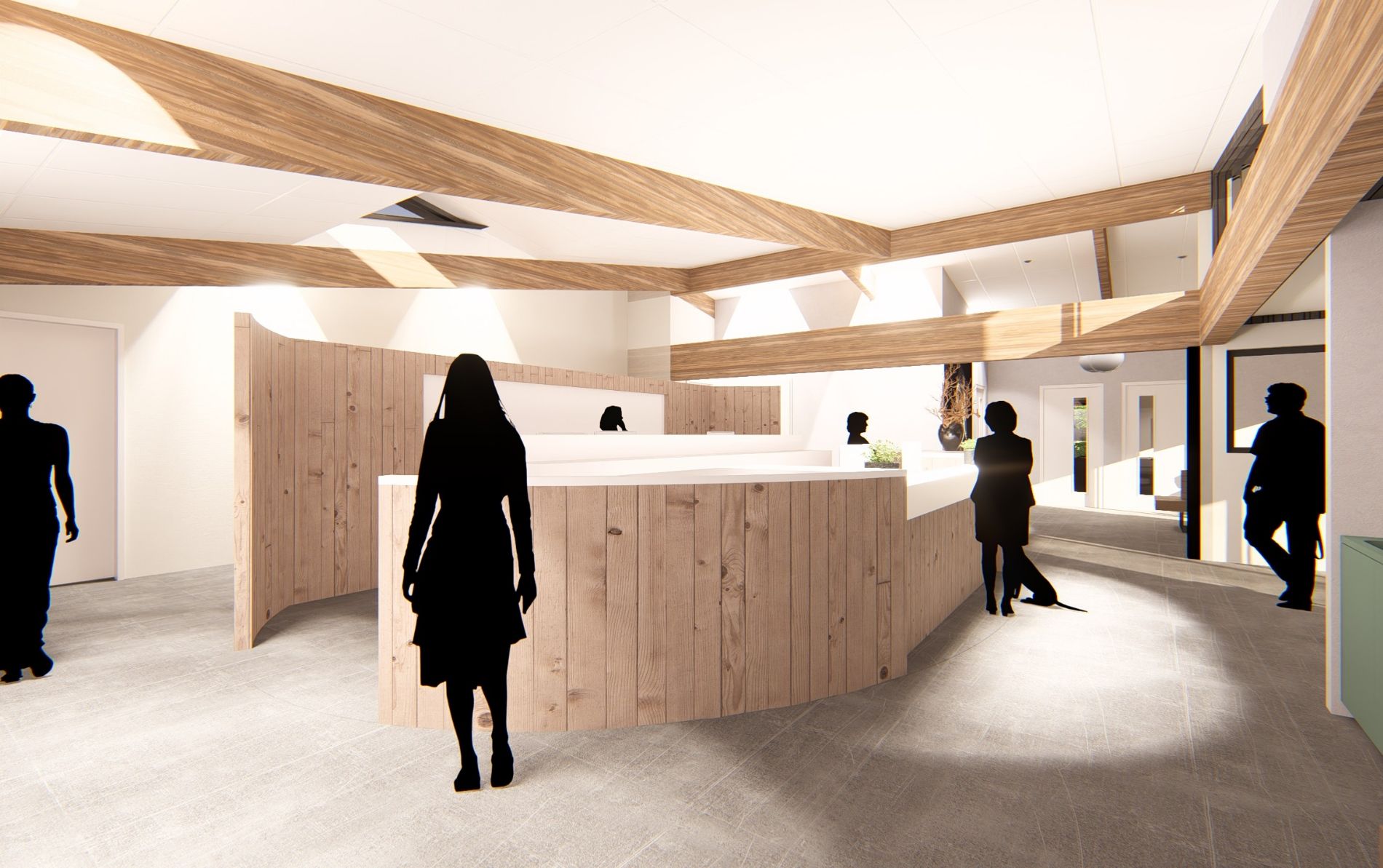 De centrale open balie in het hart van de praktijk versterkt dit beeld en vormt de kern van de praktijk .